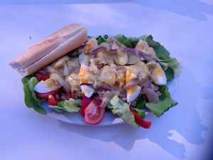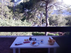 Na een heerlijke nachtrust met op de achtergrond (en zelfs met mijn gedeeltelijke doofheid kon het horen) het ruisen van de zee, ben ik aan een welverdiend ontbijt begonnen. een kleine supermarkt zit op nog geen 500 meter afstand van mijn appartement en daar is al heel veel te krijgen.
